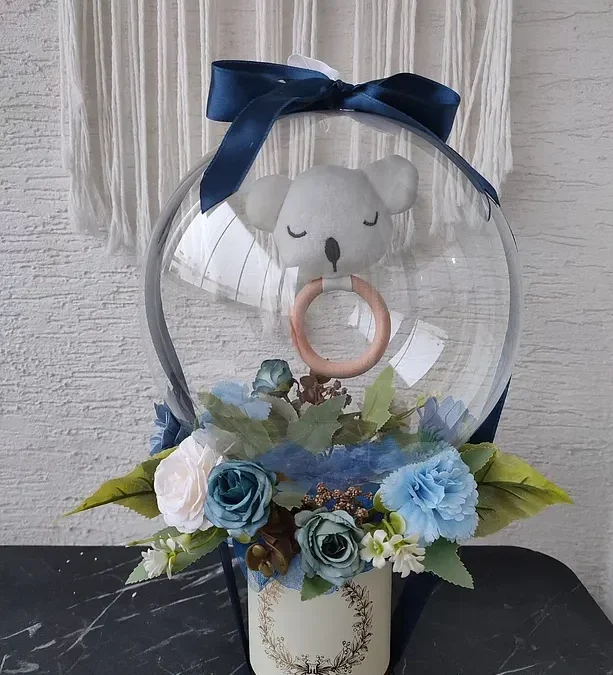 Balon içerisindeki bebek çıngırak ve mavi beyaz çiçek buketi ile birlikte sunulanbu tasarım kutusu sıradan hediyelerin aksine sevdiklerinizi büyüleyebilir.